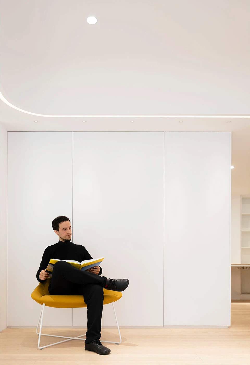 The space subtly solves the basics: the utilization of natural light and circulation of fresh air that benefits the health and everyday wellbeing. At the same time it is characterized by its’ lightness, softness, natural materials, and by its ability to evoke calmness, necessary for creating and inspiring the world.