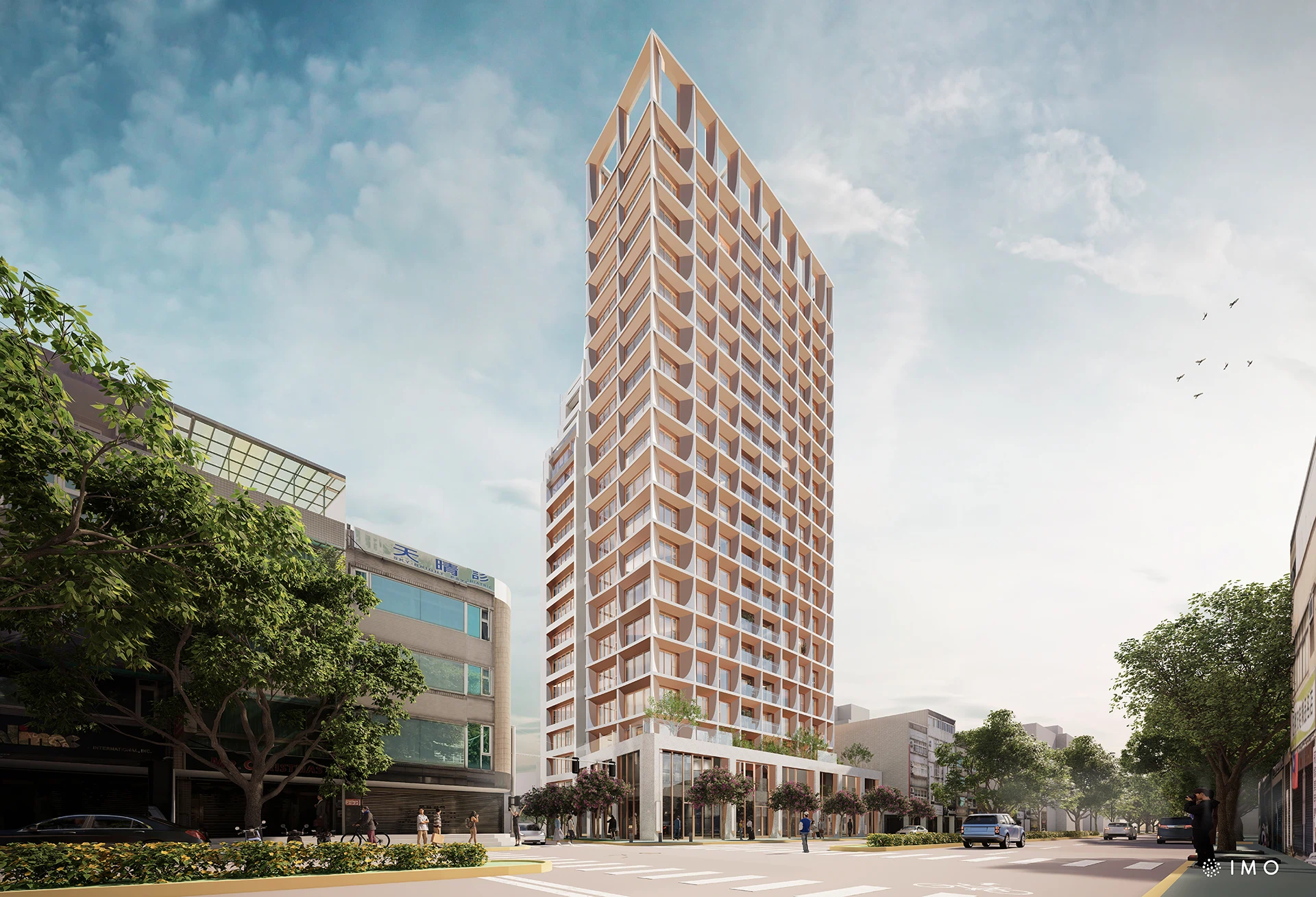 The building is composed of 2 main volumes, a stable base for commercial activity and a soft curved upper volume for residential use. The curved form is a relief from the typically orthogonal, artificial edges of the urban environment, taking inspiration from natural organic forms like the nearby mountains and more distant forests. The facade is composed of an earthy tone material that contrasts with a whiter tone material to provide users with a feeling of calmness and cleanness that combines beautifully with the numerous trees of Zhongshan North Road.